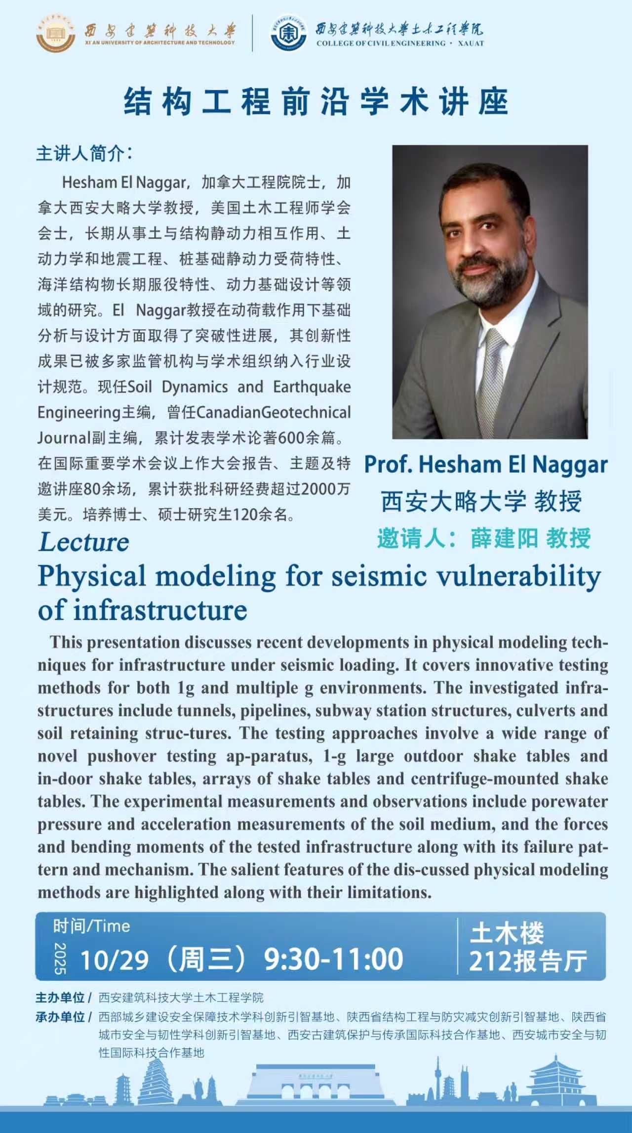 2025年10月29日9:30-11:00,学院邀请Soil Dynamics and EarthquakeEngineering主编Hesham ElNaggar教授于土木楼212报告厅作学术报告。