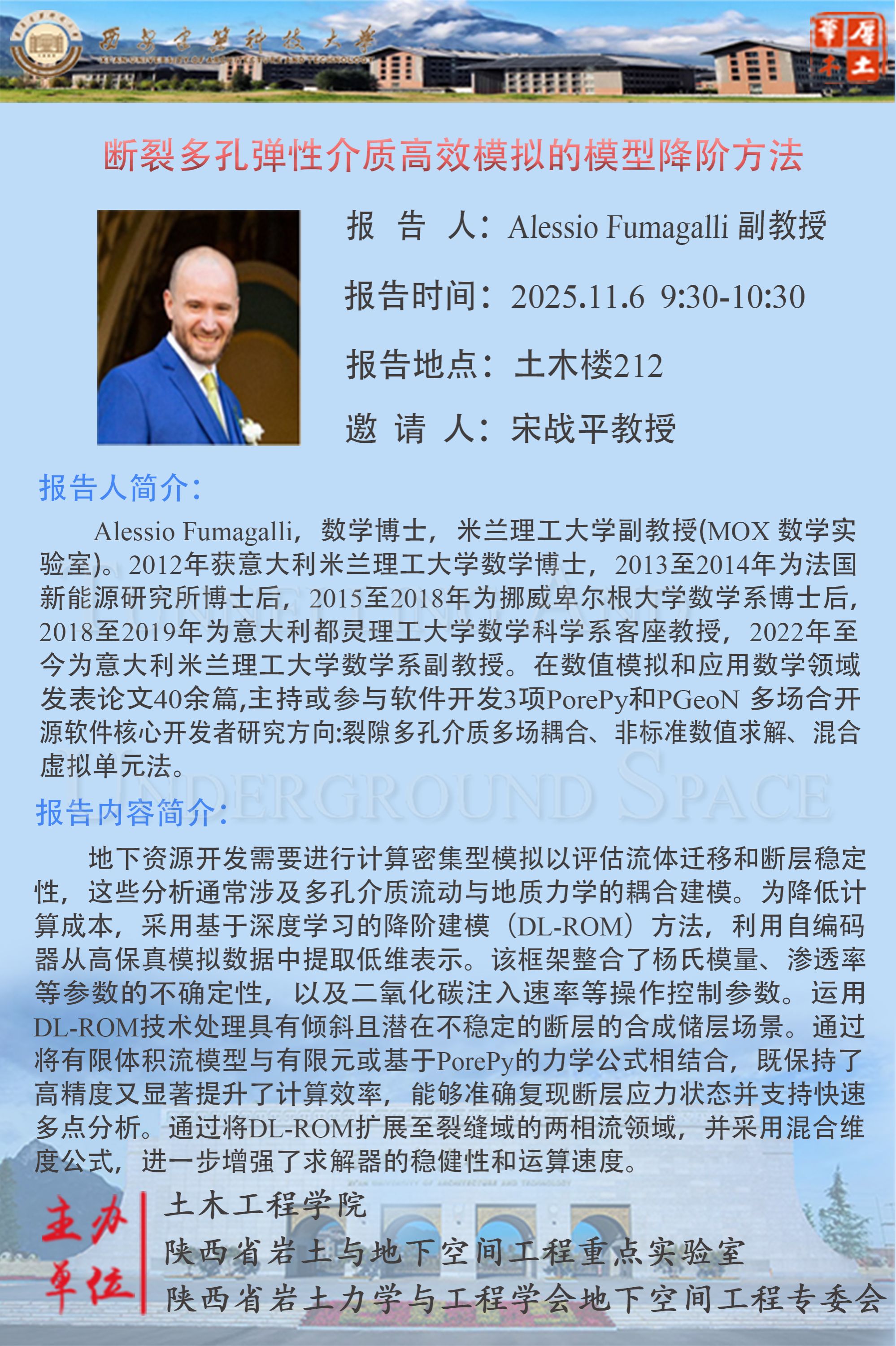 2025年11月6日9:30-10:30,学院邀请米兰理工大学副教授Alessio Fumagalli,于土木楼212报告厅作学术报告。