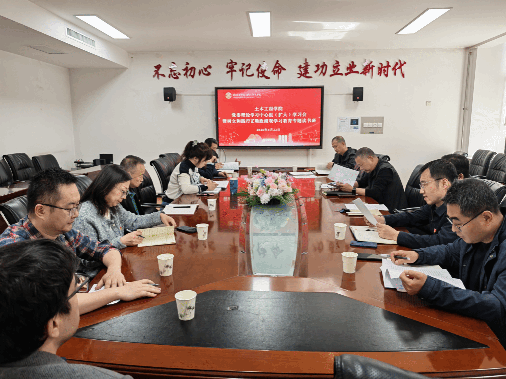 4月22日下午,土木工程学院在土木楼311会议室召开党委理论学习中心组(扩大)学习会暨树立和践行正确政绩观学习教育专题读书班。学院领导班子、党委委员、纪委委员、各教师党支部书记参加会议。党委书记江中文主持会议。