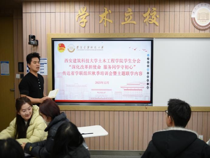 2025年12月8日,土木工程学院学生会于学府城16-108召开秋季工作人员培训会。校学生会主席团成员范嘉轩、院学生会主席团成员、各部门主要负责人及各班代表参会。会议由院学生会主席团成员刘润主持。