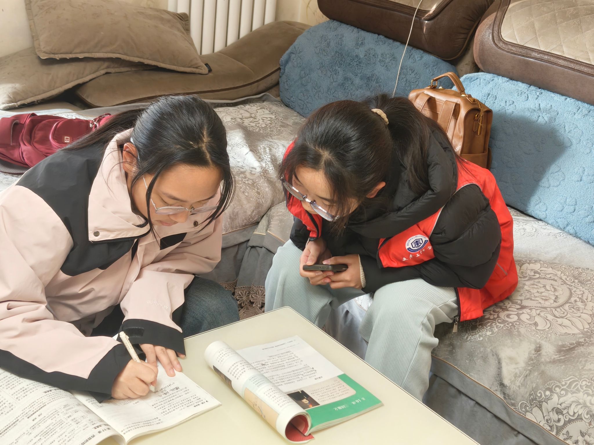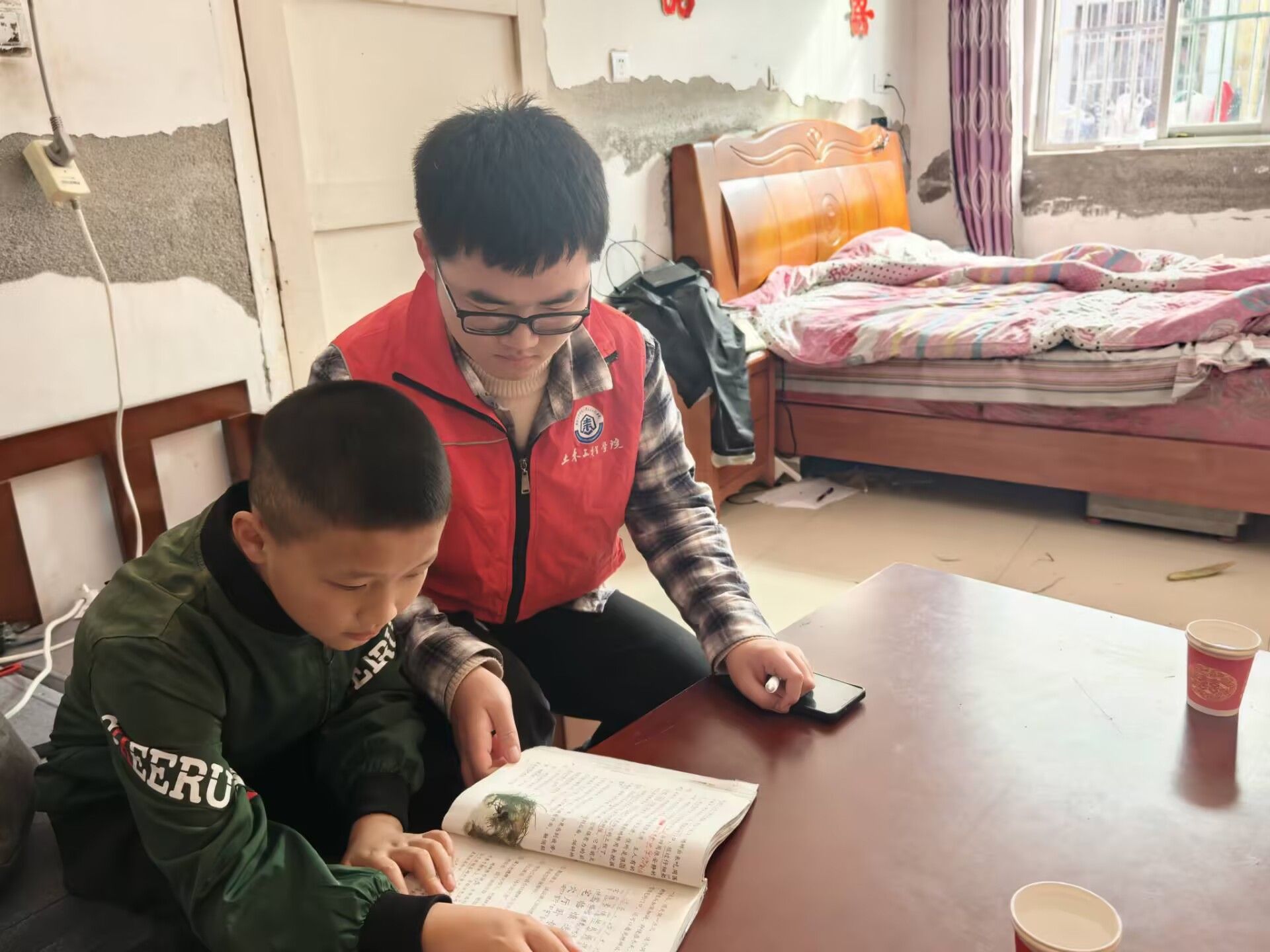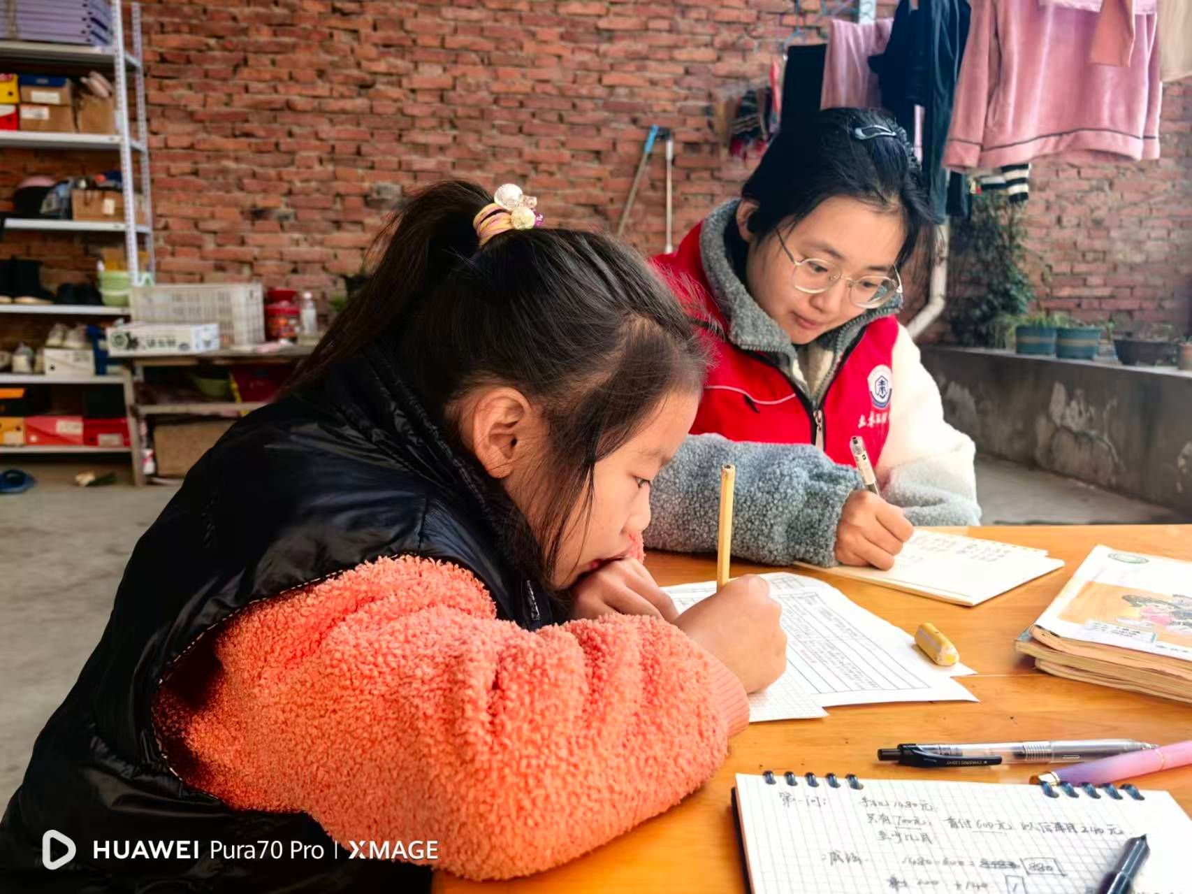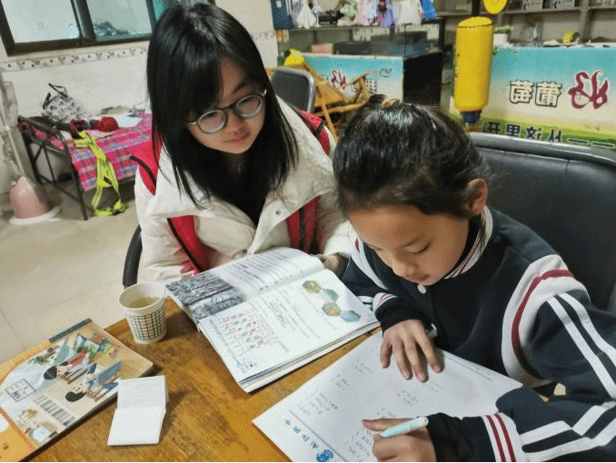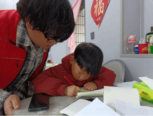 活动开始后,志愿者们迅速与孩子们结成对子,采取“二对一”的辅导方式,针对每个孩子的学习情况提供个性化帮助。一张书桌,几本作业,志愿者俯身在小朋友旁边,手指轻轻点在作业本上,耐心解释着每一道习题。