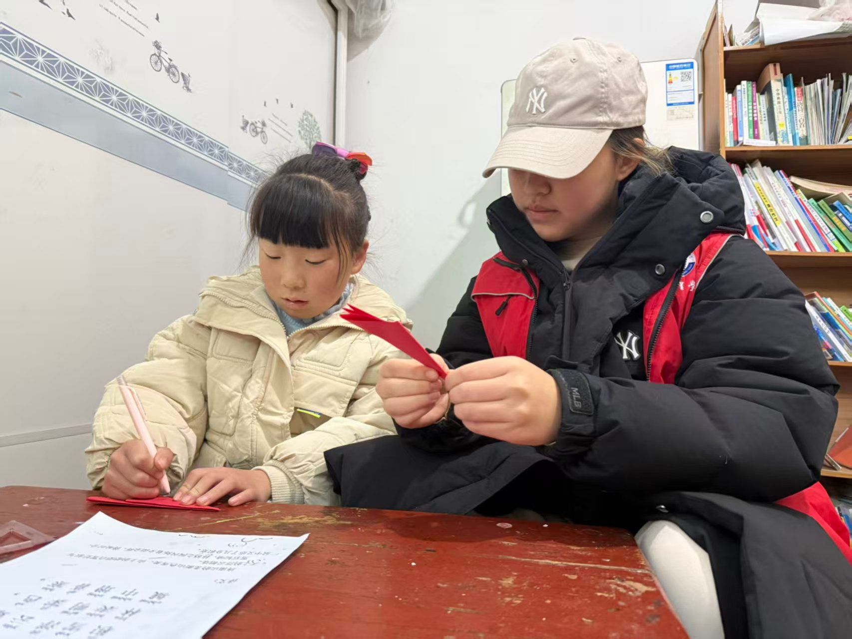 智建2502班的乔梓叶说:“合上课本的时候,我以为今天的“任务”已经完成了——直到那只勾住我袖子的小手,把我拉进了更柔软的时刻。辅导作业时,她攥着笔的指节都在用力,把字写得像小树苗一样歪却挺拔;而转身翻出红纸,她眼睛亮得像落了星。原来支教从不是单向的“给予”。和小朋友一起做手工的时刻早就把冬天的寒意驱散了。”