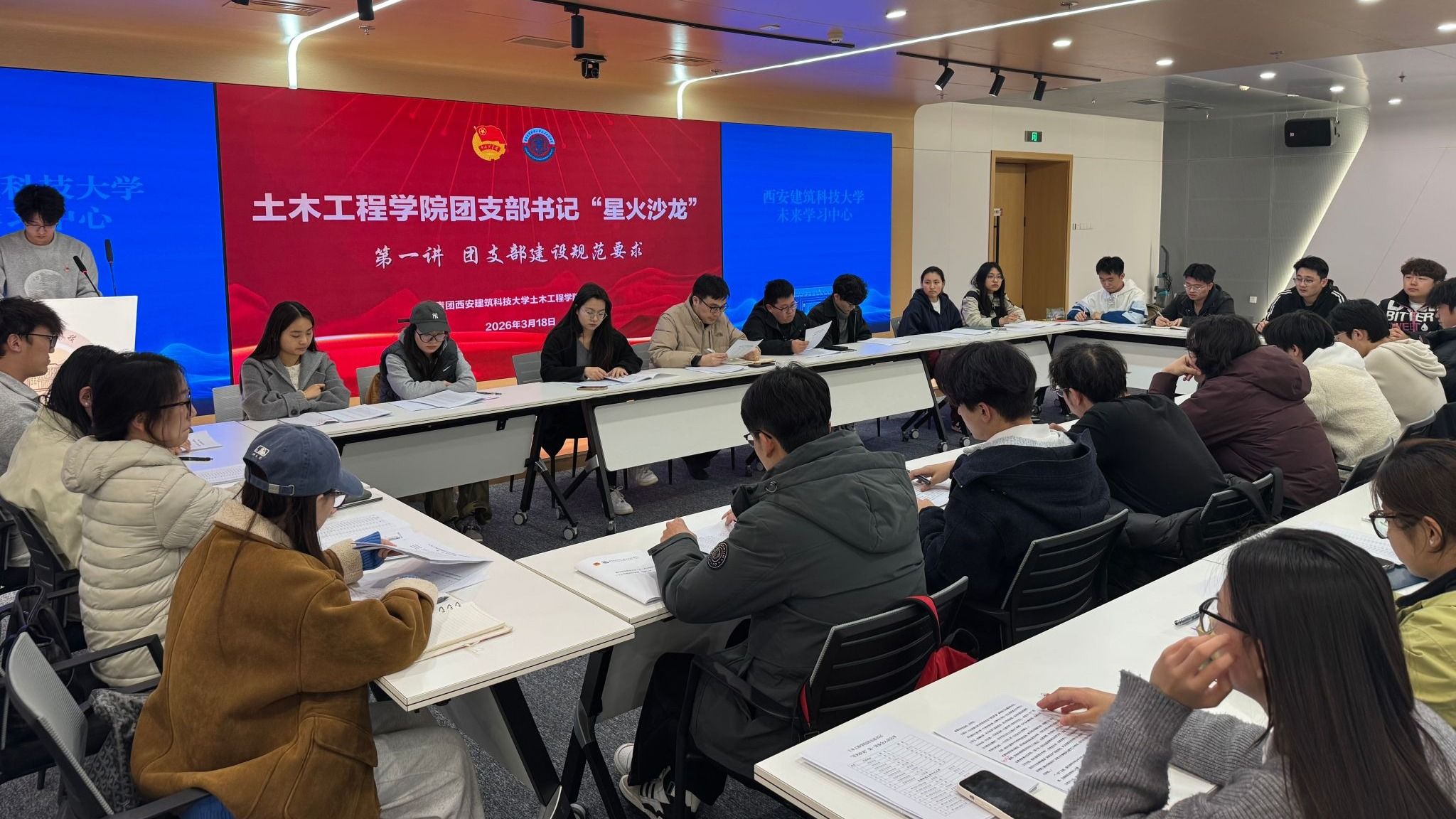 3月18日晚,土木工程学院团支部书记“星火沙龙”第一讲在草堂校区图书馆多功能厅举行。学院团委书记綦玥、团委副书记高垚同全体团支部书记、团委直属学生组织骨干聚焦团支部建设规范要求开展集体学习与研讨交流。