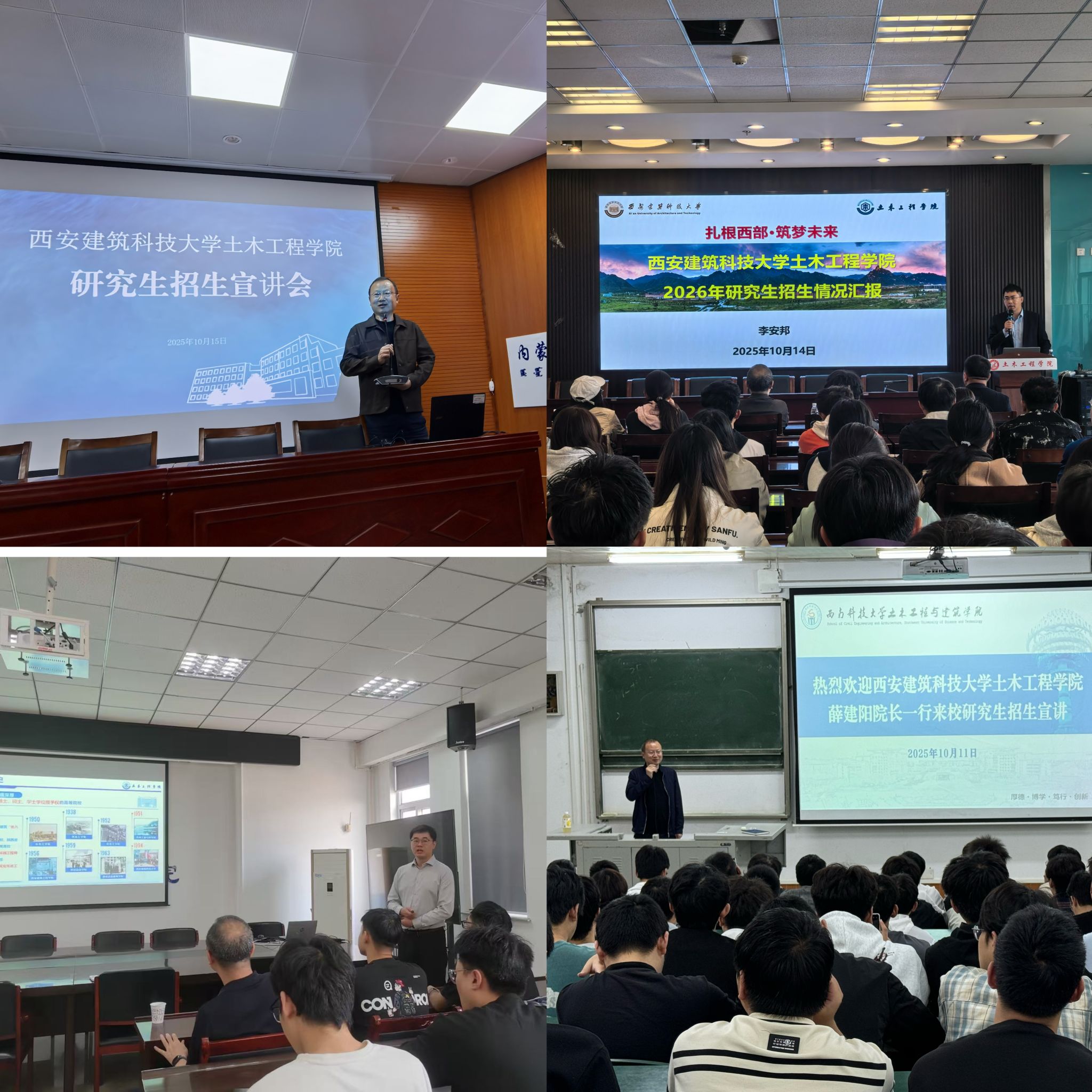 为进一步提升研究生生源质量,深化与其它高校的合作交流,土木工程学院积极贯彻落实《土木工程学院2026年研究生招生宣传工作方案》,于9月23日至10月15日,由学院领导带队,联合教师、研究生培养办和学工办组建多支校外宣传团队,先后奔赴陕西理工大学、河南科技大学、河南工业大学、河北科技大学、西南科技大学、内蒙古科技大学、内蒙古工业大学等9所高校开展2026年硕士研究生招生宣传工作。
