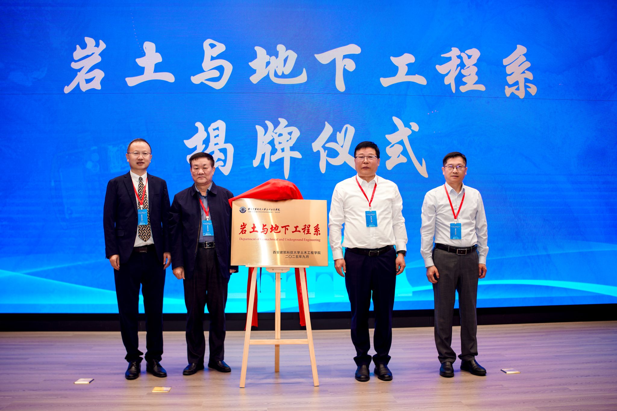 学院院长薛建阳教授宣读了成立西安建筑科技大学土木工程学院岩土与地下工程系成立的通知。刘晓武、郑建国、党发宁、薛建阳共同为岩土与地下工程系揭牌。
