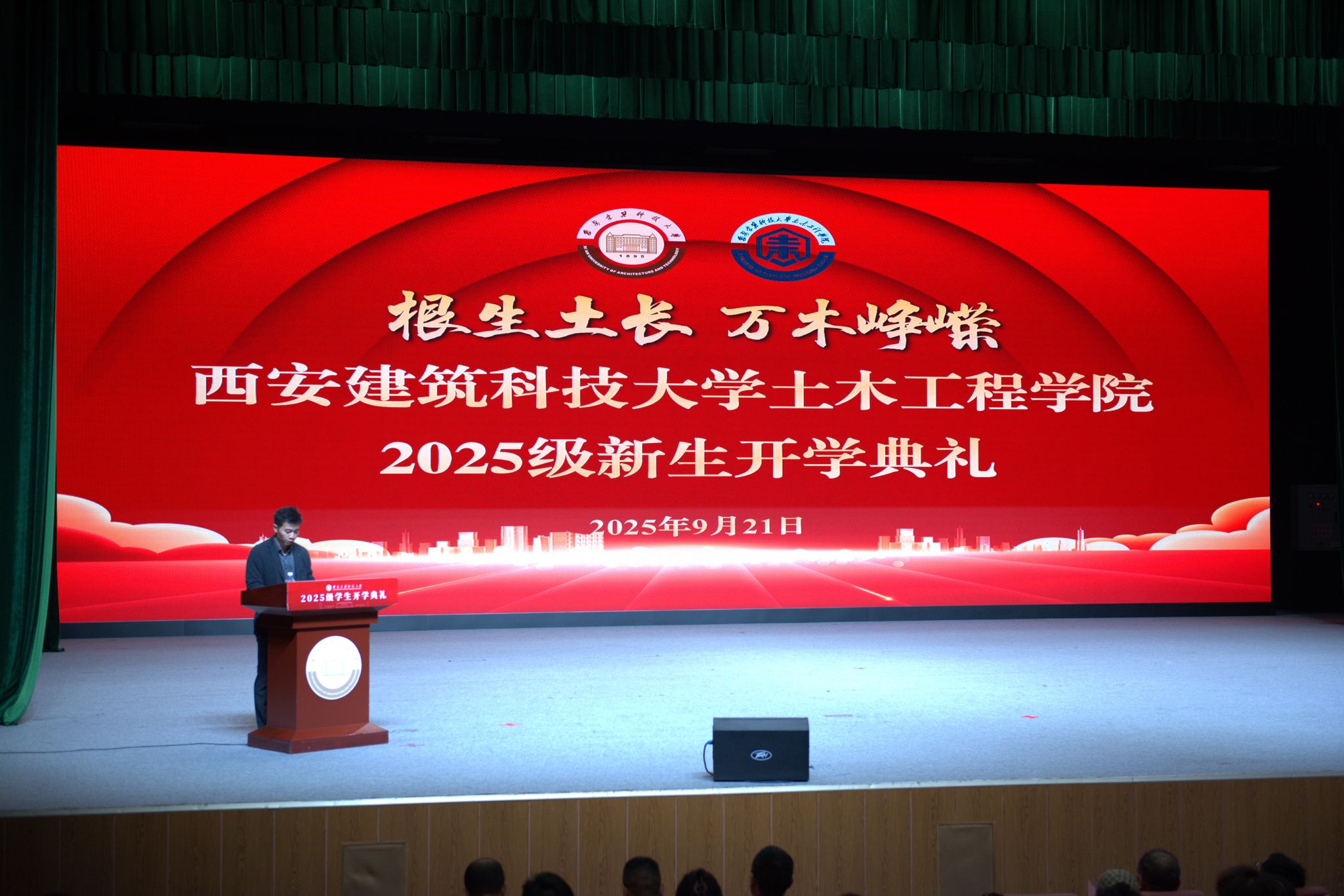 9月21日,我院2025级新生开学典礼暨新学期第一课在草堂校区紫阁大礼堂举行。学院院长薛建阳,中建四局西北公司人力资源部副经理李江波,中建四局西北公司基础设施分公司人力资源部经理白世鹏,党委副书记、副院长李路路,副院长门进杰,院长助理李安邦,国际教育学院辅导员武瑞英,学院各教研室支部书记、主任,学院机关各职能科(室)负责人,本科生学业导师、朋辈导师代表,各年级学生辅导员以及全体2025级新生参加了此次开学典礼。典礼由学生工作办公室主任屈鹏飞主持。
