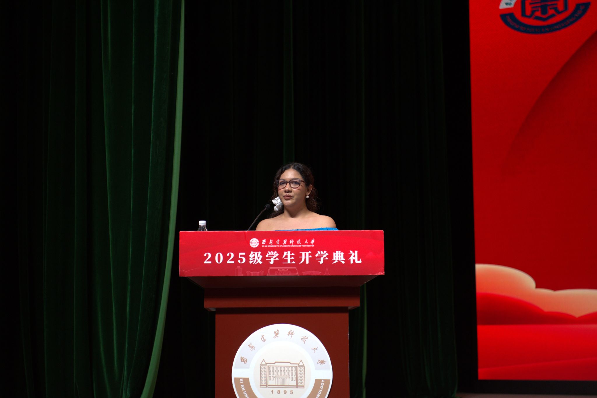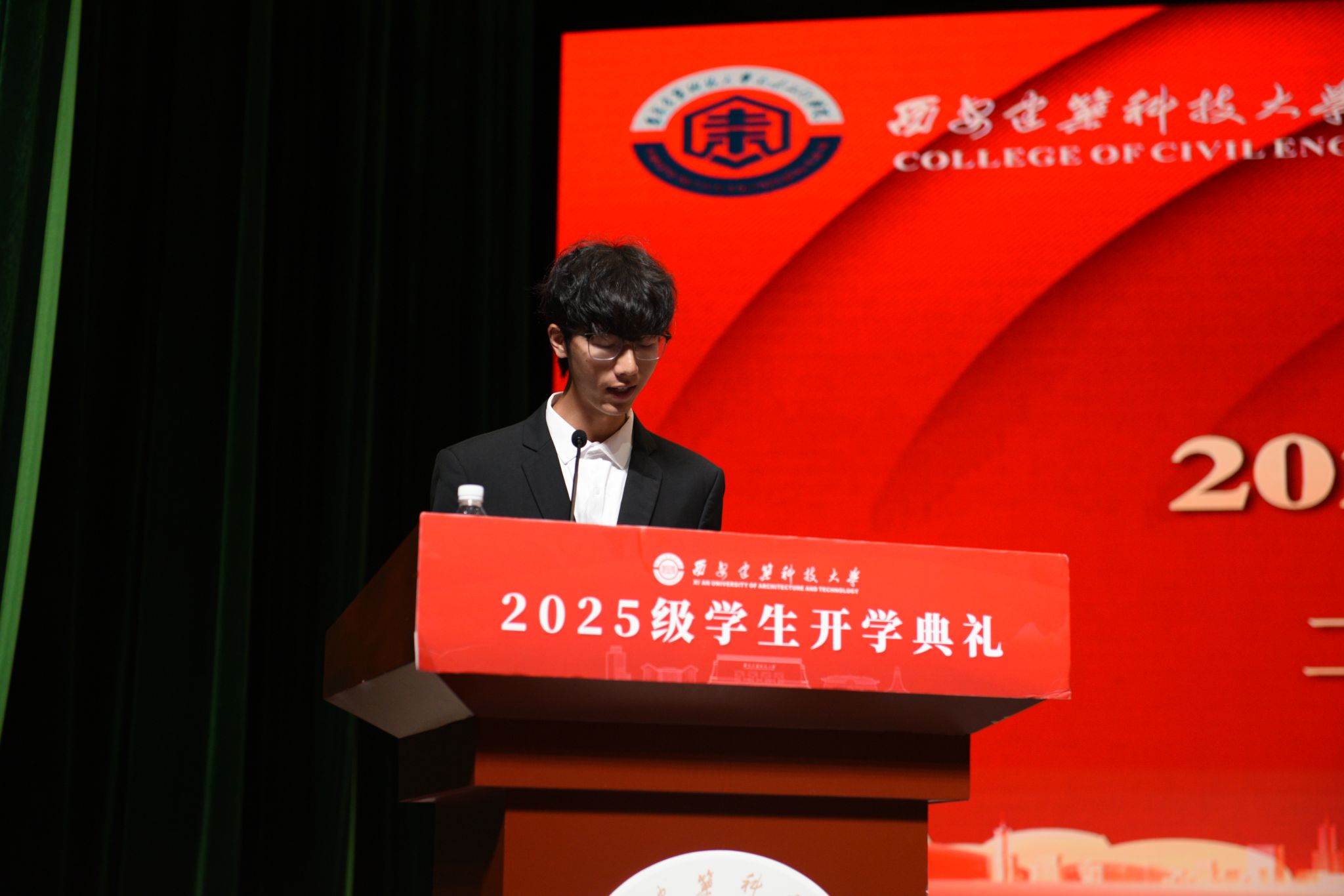 2025级本科生代表陈奕豪、2025级研究生代表崔航瑜、2025级留学生代表文美玲(萨尔瓦多籍 英文名:CASTRO GUILLEN WENDY MILAGRO)分别发言,表达了他们对大学生活的憧憬与决心,承诺将勤奋学习、积极进取,传承土木人的精神与担当。在校生代表袁子陈同学分享了自己的学习与科研经历,鼓励新生们勇于探索、敢于突破,在学术与人生的道路上不断前行。