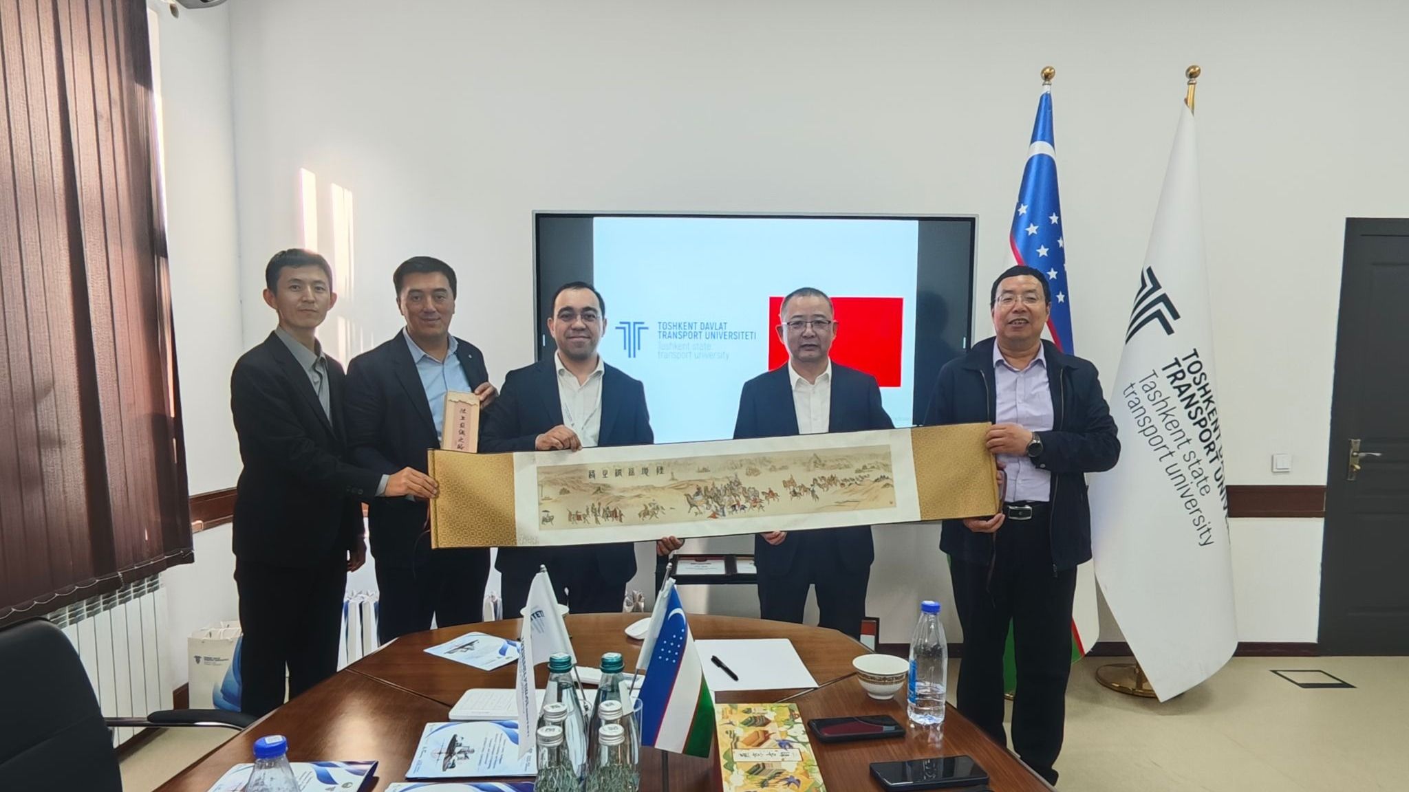 10月7日,代表团与塔什干国立交通大学副校长Shaumarov Said Sanatovich教授及该校国际交流部门负责人Ulugbek Israilov先生举行工作会议。双方回顾了近期合作成果,并就共建“能源与交通基础设施一带一路联合实验室”、联合申报国际科研项目等议题达成重要共识。会谈明确将建立常态化合作机制,推动科研人员结对开展联合研究,助力乌兹别克斯坦交通基础设施建设。