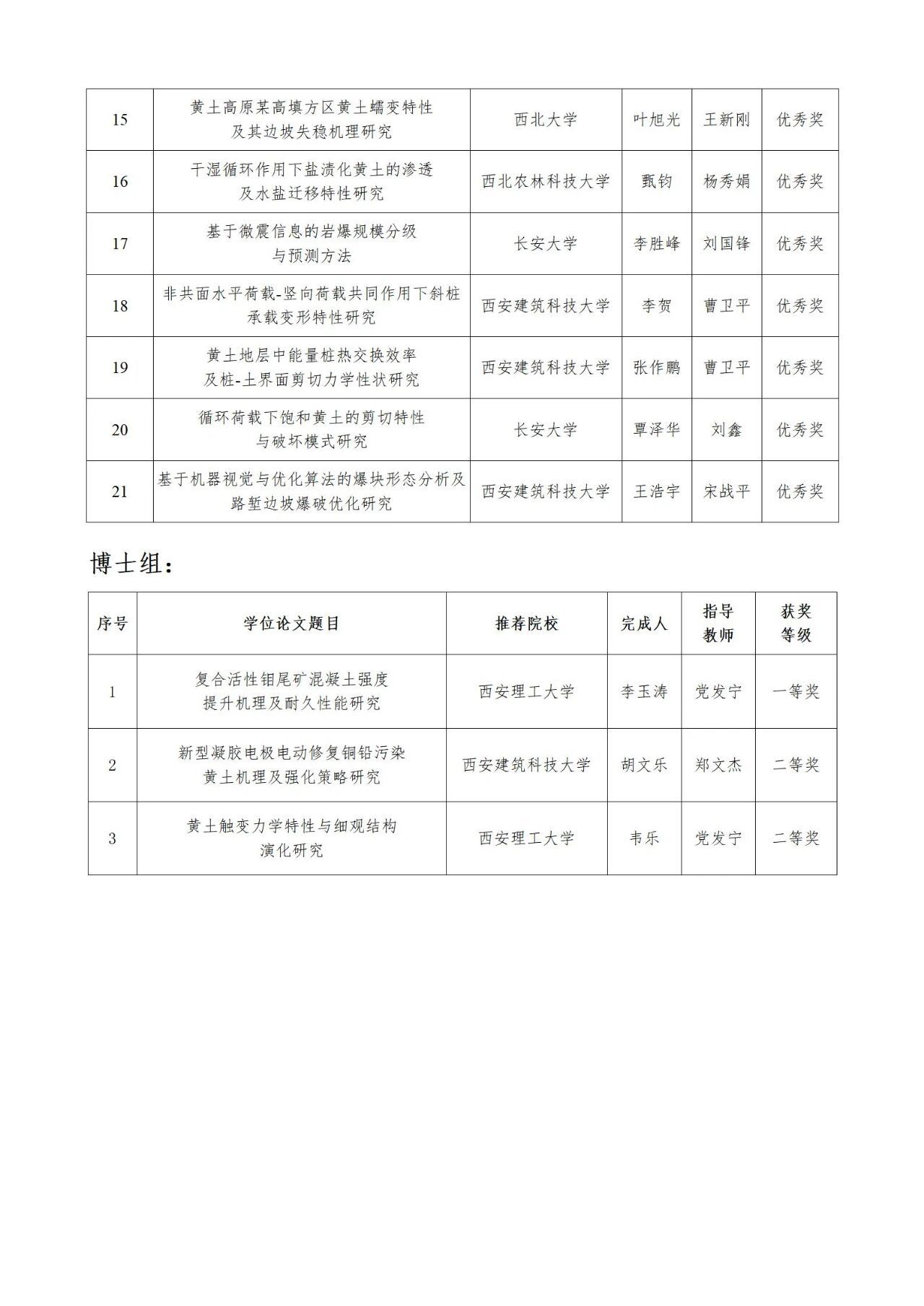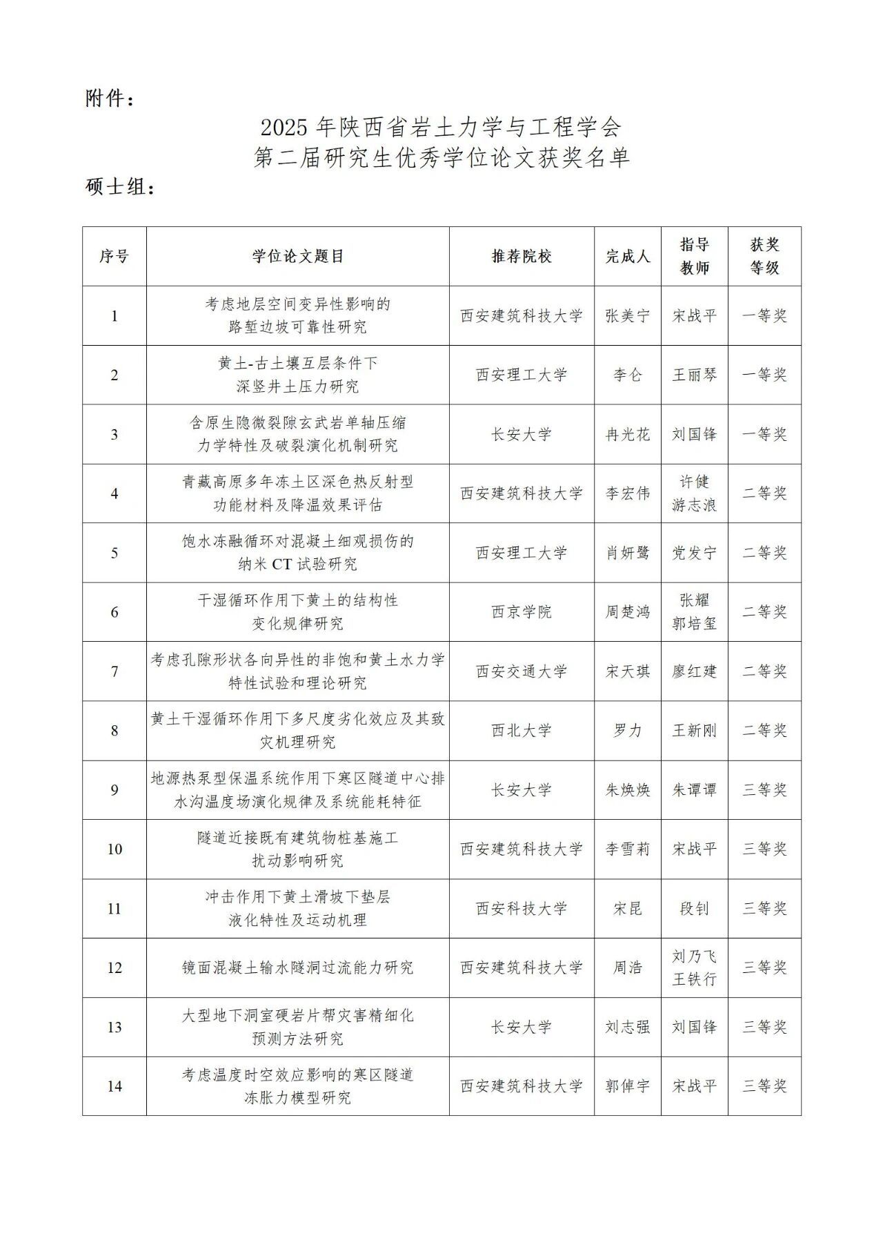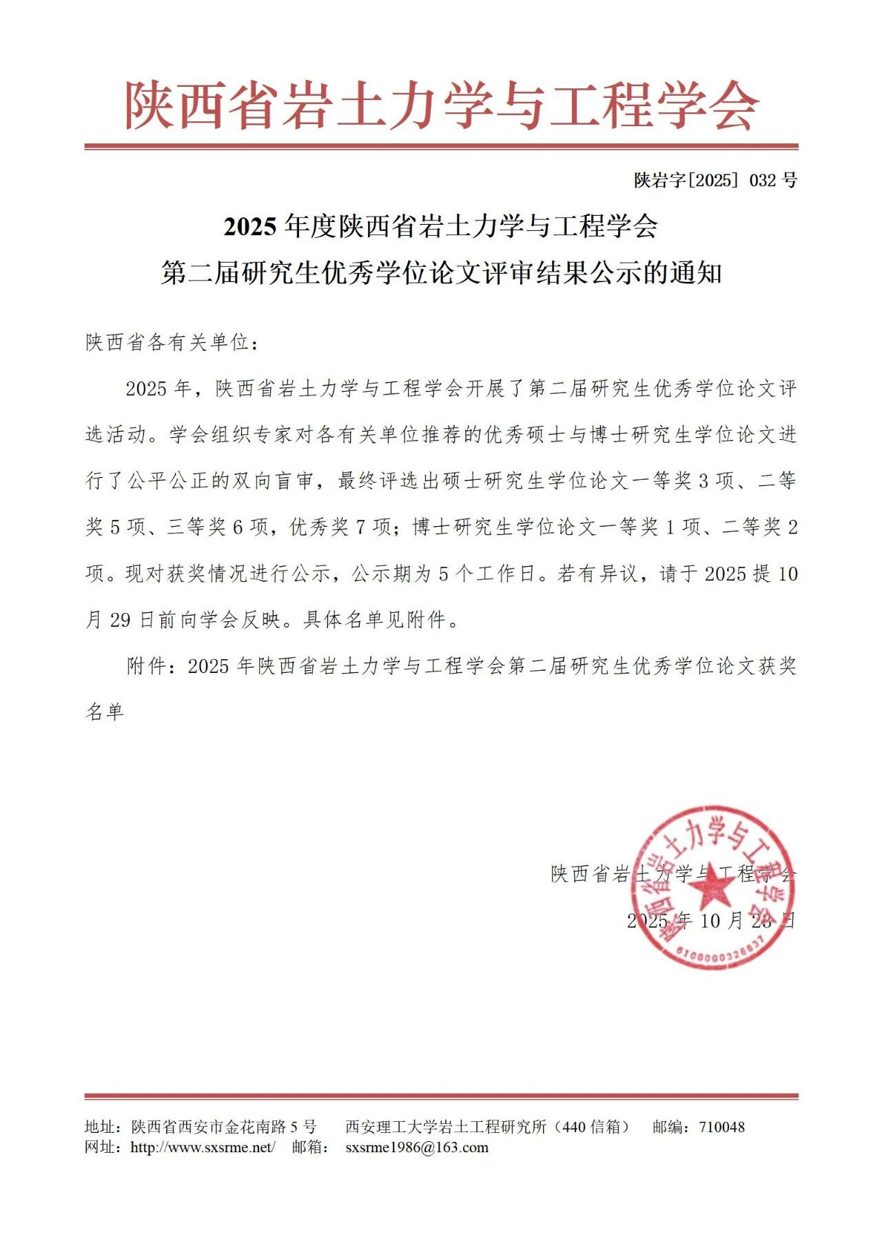 近日,陕西省岩土力学与工程学会公布了第二届研究生优秀学位论文评选结果。学会组织业内专家对申报的论文进行了严格评审,最终评选出一等奖4项、二等奖7项、三等奖6项及优秀奖7项。