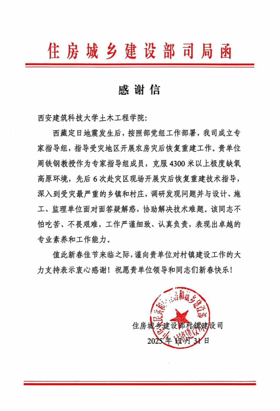 近日,住房城乡建设部村镇建设司致信西安建筑科技大学土木工程学院,对我院周铁钢教授在支援西藏定日地震灾后农房恢复重建工作中的突出贡献予以感谢,对其临危受命、勇挑重担的专业精神与责任担当予以高度肯定。