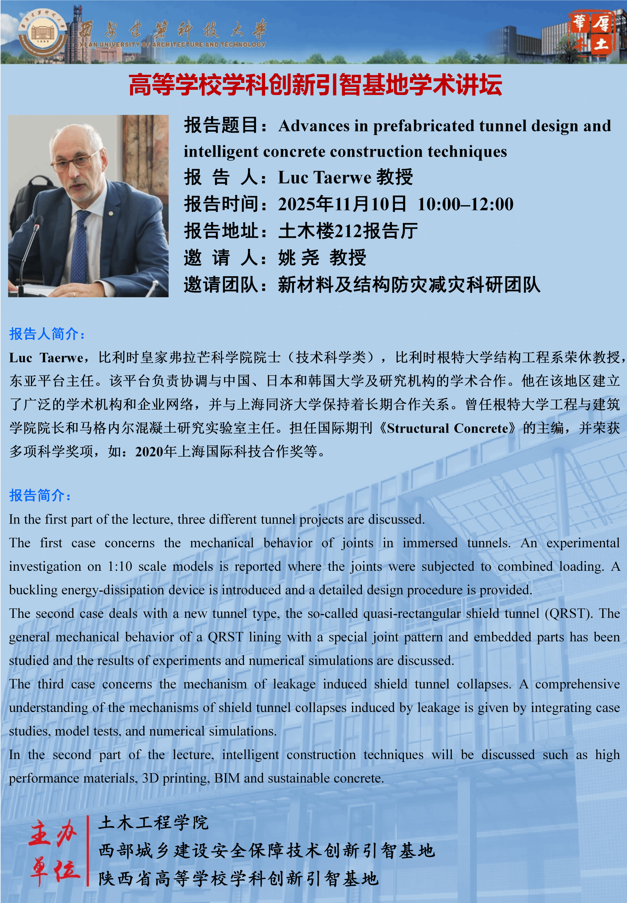 2025年11月10日10:00-12:00,学院邀请比利时皇家弗拉芒科学院院士Luc Taerwe,于土木楼212报告厅作学术报告。